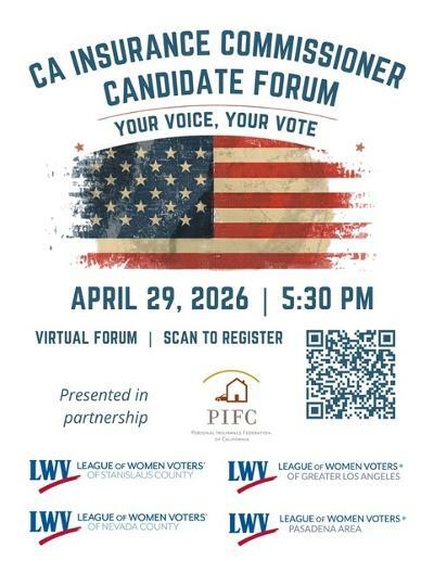 The LWV of Stanislaus County, in partnership with the LWV of Greater Los Angeles, LWV of Nevada County, LWV of Pasadena Area, and the Personal Insurance Federation of California, are partnering to host a virtual candidate forum for the office of California Insurance Commissioner.